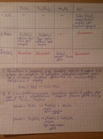 в четырех колбах без этикеток находятся растворы:сульфата железа(3) , сульфата железа (2),сульфата натрия и вода.Как практически определить эти вещества ,опишите порядок предполагаемых действий,приведите уравнения соответствующих реакций