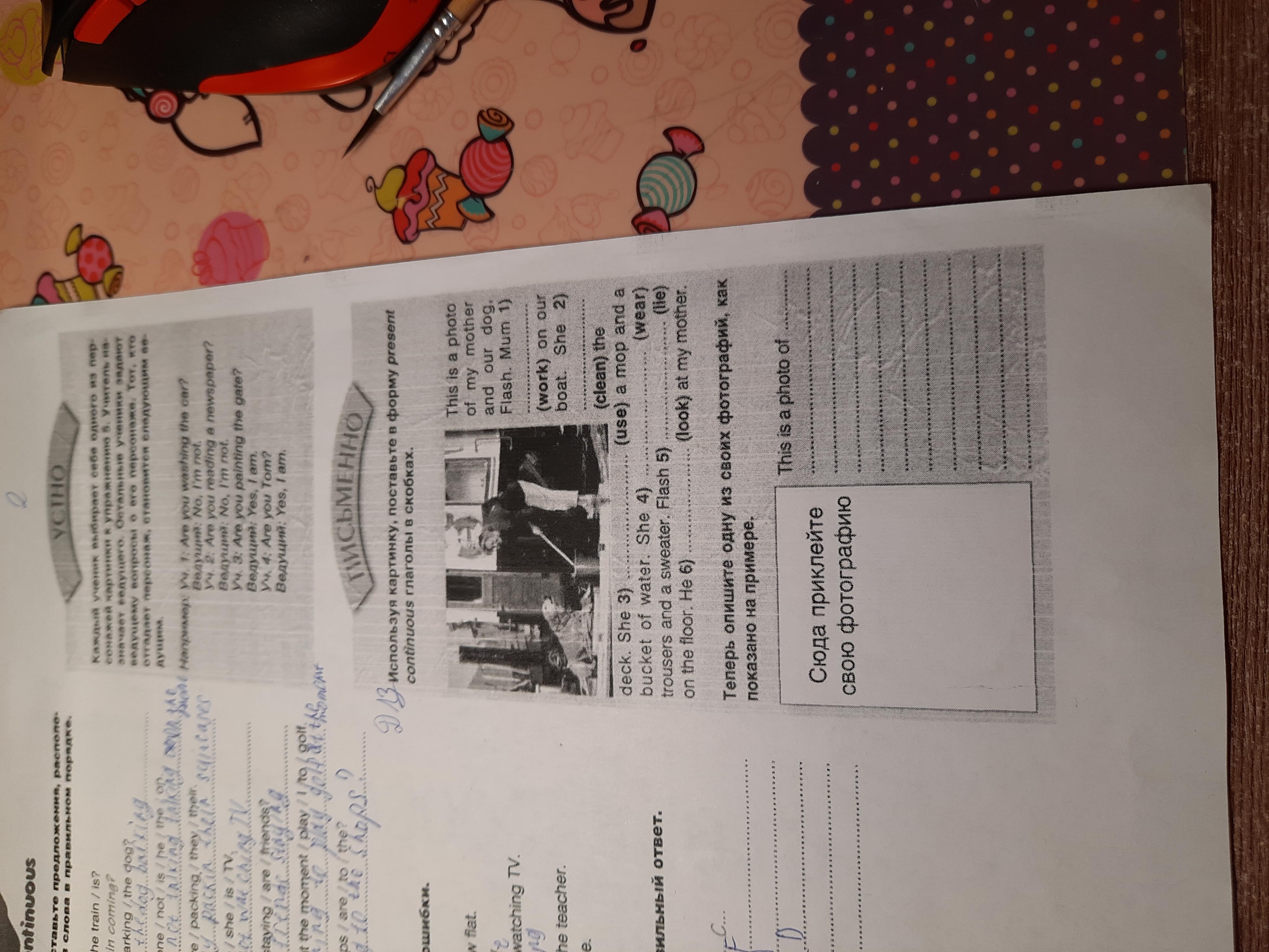 если ты говоришь про описание своего фото, то вот: the photo shows my family, this is my very funny and wise dad, and this is my good and beautiful mother, my brother is playing with a ball, and I am standing next to my mother