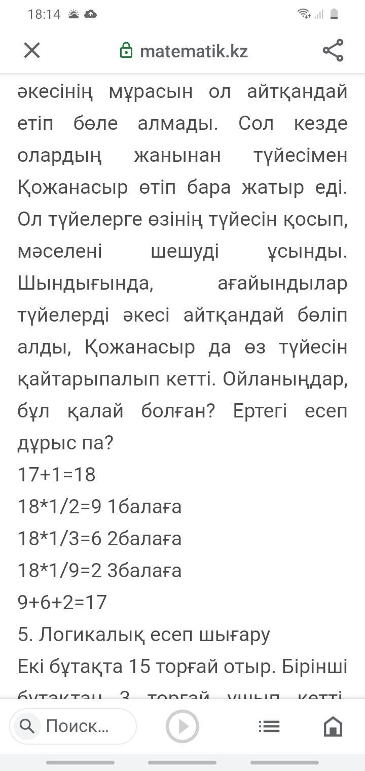 Парсы шаруасы ғш ұлына 17 түймесін мұраға қалдырды. Бірінші ұлына барлық түйесініңи1/2ін екінші ұлына 1/3 ін үшінші ұлына 1/9алуды тапсырды. Ағайындылар көп ойланды бірақ әкесінің мұрасын ол айтқандай етіп етіп бөле алмады 690есеп 5сынып көмектесіңдерші пж