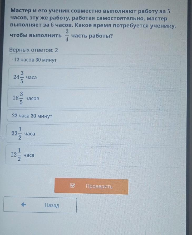 Мастер и его ученик совместно выполняют работу за 5 часов, эту же работу, работая самостоятельно, мастер выполняет за 6 часов. Какое время потребуется ученику, чтобы выполнить 3/4 часть работы? ПОЖАЛУЙСТА