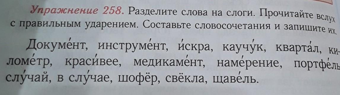 Разделите слова на слоги. Прочитайте вслух с правильным ударением. Составьте словосочетания и запишите их.