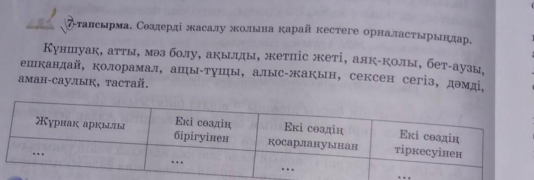 7-тапсырма. Сөздерді жасалу жолына қарай кестеге орналастырыңдар.