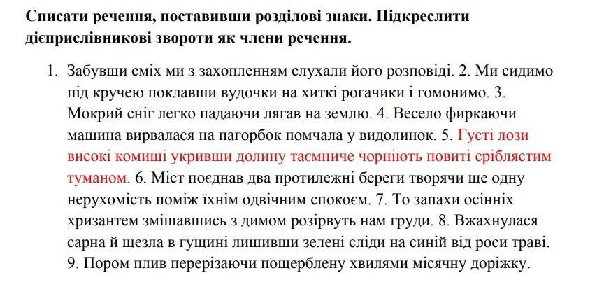 1. Забувши сміх, ми із захопленням слухали його розповіді. 2. Ми сидимо під кручею, поклавши вудочки на хитрі рогачики, і гомонімо. 3. Мокрий сніг, легко падаючи, лягав на землю. 4. Весело фиркаючи, машина вирвалася на пагорбок, помчала у видолинок. 5. Густі лози, високі камиші, укривши долину, таємниче чорніють, повиті сріблястим туманом. 6. Міст поєднав два протилежні береги, творячи ще одну нерухомість поміж їхнім одвічним спокоєм. 7. То запахи осінніх хризантем, змішавшись з димом, розірвуть нам груди. 8. Вжахнулася сарна й щезла в гущині, лишивши зелені сліди на синій від роси траві. 9. Пором плив, перерізаючи, пощерблену хвилями, місячну доріжку.