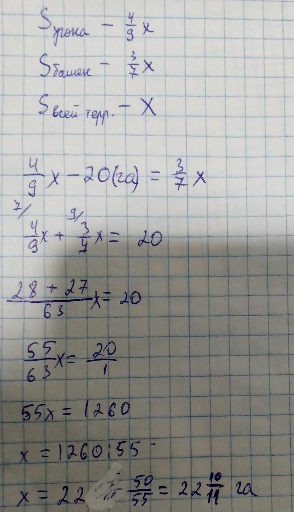 4/9 от всей территории хозяина занята угон 3/7 всей территории башни осталось лишь найти площадь всей территории хозяина в повести леса если известно что площадь круга больше площади башен на 20 га