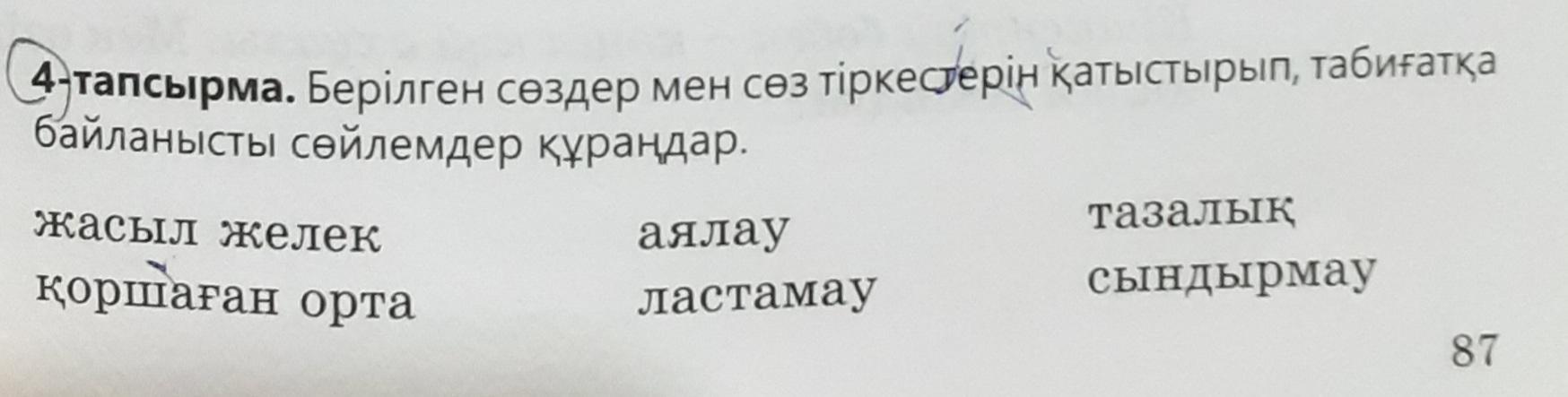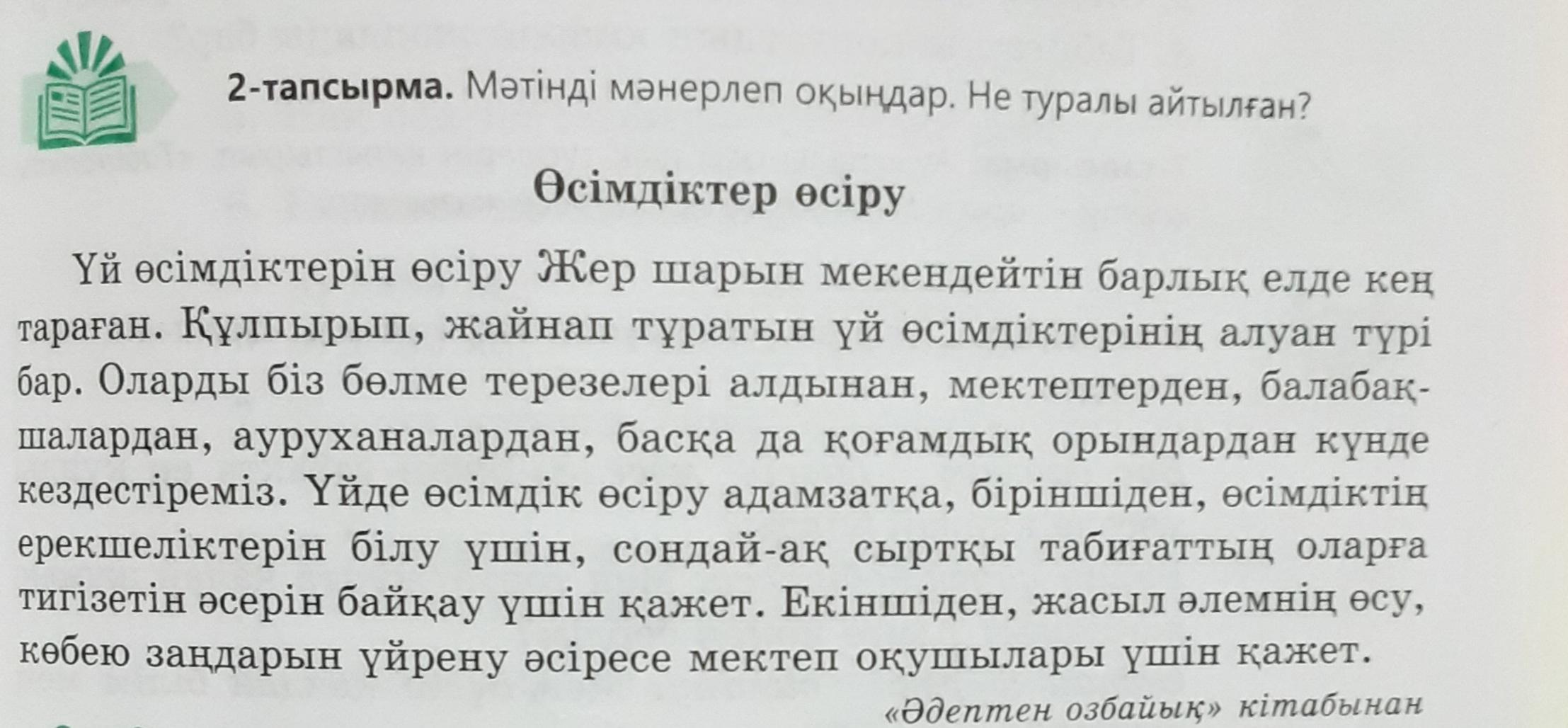 Тут нужно по тексту составить 3 вопроса на казахском языке, а в 4-тапсырма с данными сллвами составляете предложения на казахском языке.