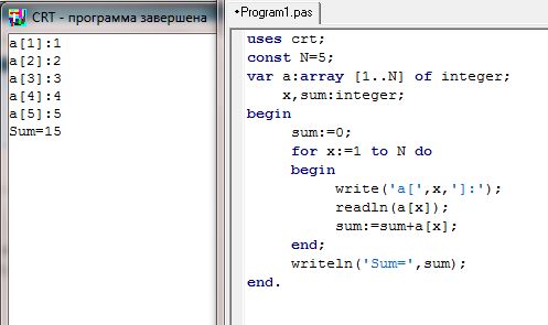 Составить программу на суммирование элементов массива. Произвести ввод и отладку программы, проанализировать полученный результат.