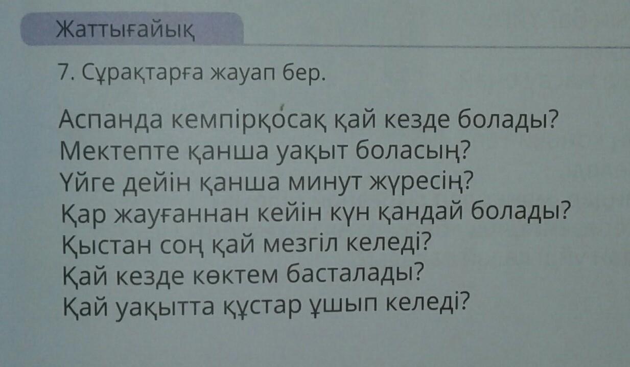 Ответ:таңертеңнен түске дейін жаңбыр жауған кезде менің үйім жақын .Мен үйге 13 минутта тез келемін бұлтты көктем қыстан кейін жазда жылы болған, кезде