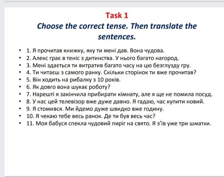 1. I read the book you gave me. She is wonderful. . 2. Alex has been playing tennis since childhood. He has many awards. 3. I think you spent a lot of time on this silly game. . 4. You read in the morning. How many pages have you read? . 5. He goes fishing for 10 years. how long is she looking for a job? 6. How. 7. Finally finished cleaning the room, but I have not washed the dishes. . 8. We have this TV for a long time. I think it's time to buy a new one. . 9. I'm tired. We have been walking very clearly for an hour. . 10. I've been waiting for you all morning. Where have you been all this time? . 11. My grandmother baked a wonderful cake for the holiday. I've already eaten three pieces.