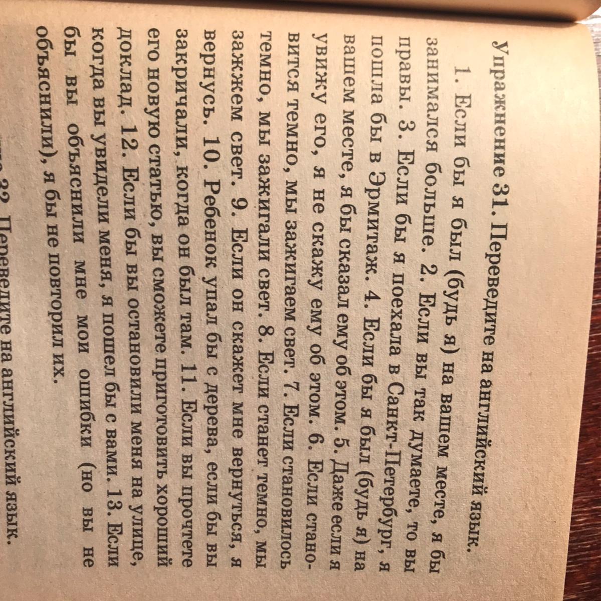 Exercise 31. Translate into English. 1. If I were (if I were) in your place, I would do more. 2. if you think so, then you are right. 3. If I went to St. Petersburg, I would go to the Hermitage. 4. If I were in your position, I would tell him so. 5. Even if I see him, I won't tell him. 6. if it becomes dark, we turn on the light. 7. if it got dark, we turned on the light. 8. if it gets dark, we'll turn on the lights. 9. If he tells me to come back, I'll come back. 10. a child would fall from a tree if you screamed while he was there. 11. if you read his new article, you will be able to prepare a good report. 12. if you had stopped me in the street when you saw me, I would have gone with you. 13. if you explained my mistakes to me (but you didn't), you wouldn't repeat them. in the English language.