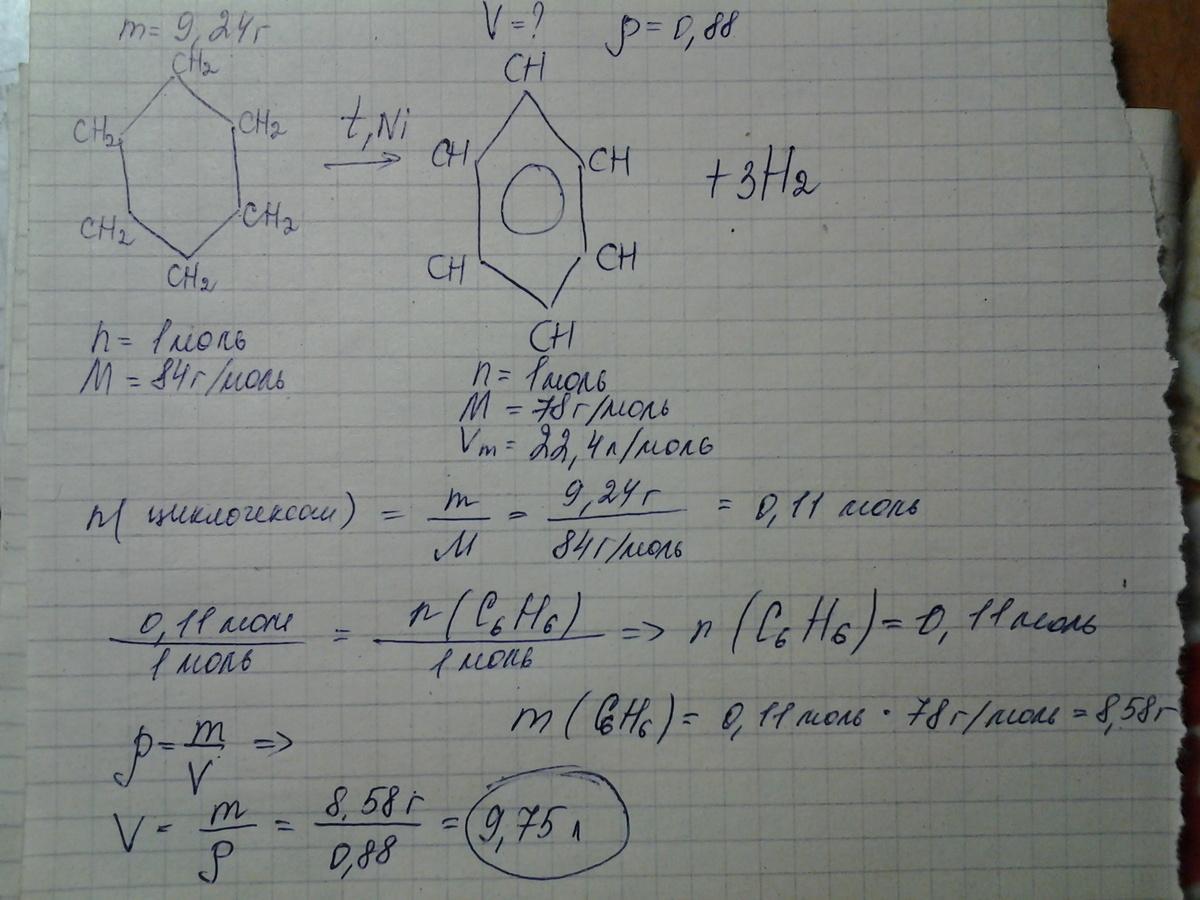 Химия. Решите, пожалуйста. Из циклогексана массой 9,24г получили бензол, рассчитайте его обьем если плотность равна 0,88г/мл