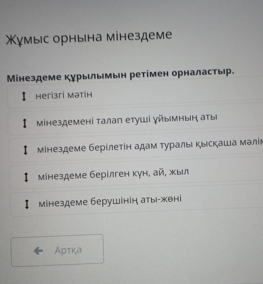 1. мінездеме берілетін адам туралы қысқаша мәлімет 2. негізгі мәтін 3 мінездеме талап етушінің ұйымның аты 4. мінездеме берушінің аты-жөні 5. мінедеме берілген күн, айы