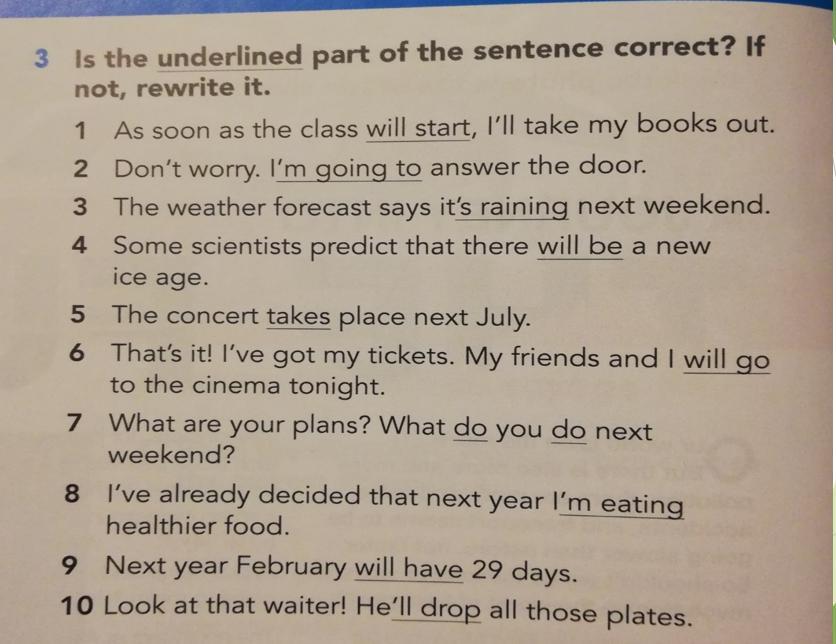 3)The weather forecast says it will rain/it’s going to (both are right)next weekend