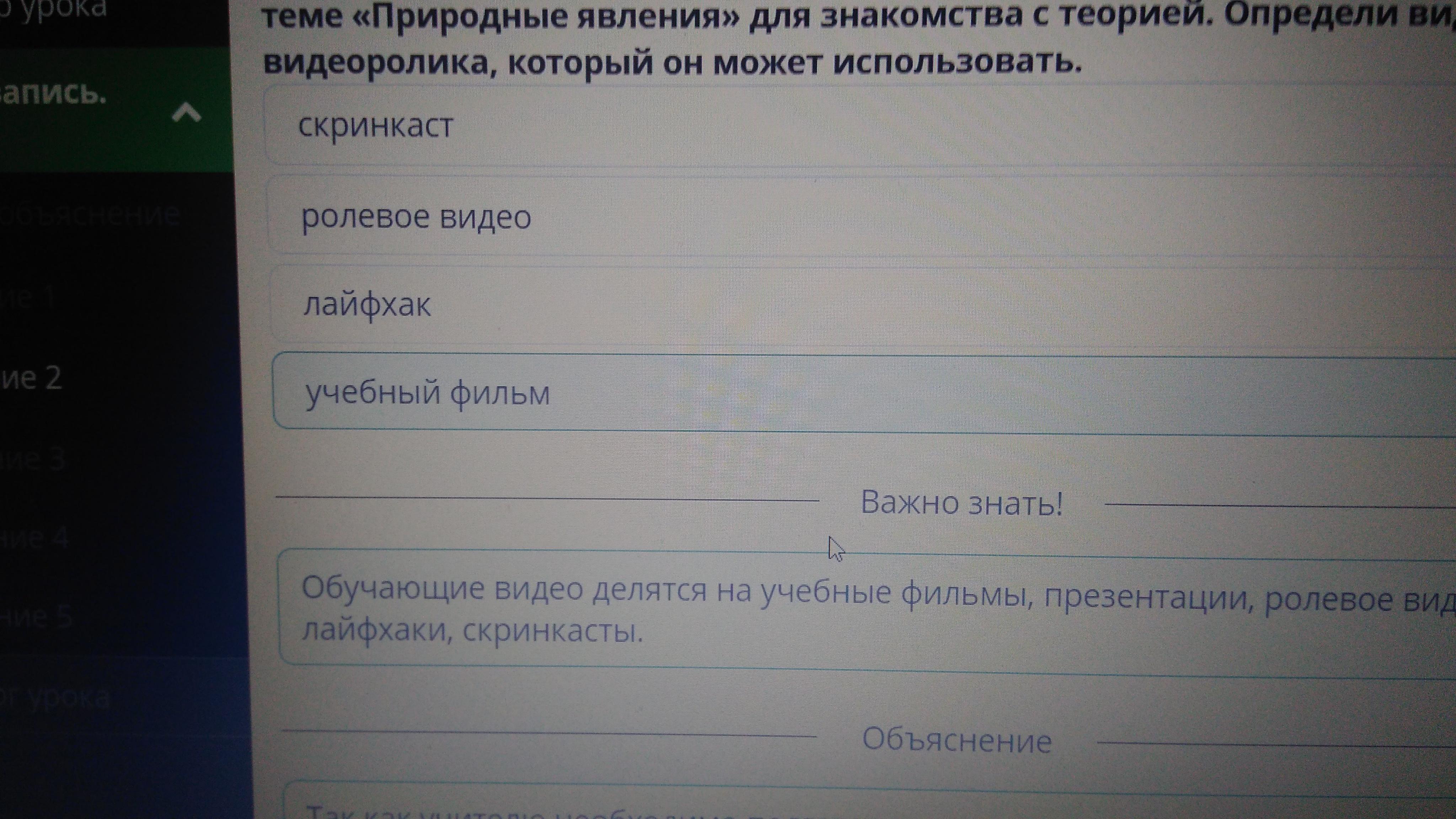 учителю естествознания необходимо подготовить видеомптериал к уроку по теме природные явления для знакомства с теорией.определи вид видеоролика который он может использовать