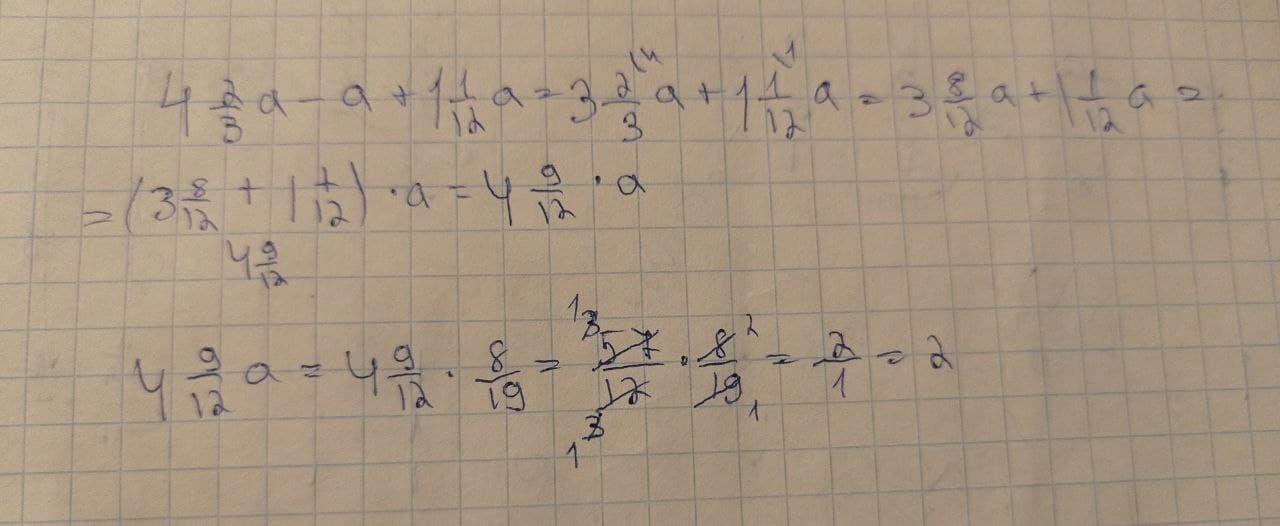 упростите выражение 4 целых 2/3 а - а + 1 целая 1/12 а и найдите его значение при А равняется 8/19