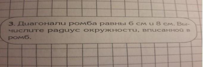 S = \frac{1}{2} d_1d_2= \frac{1}{2} *6*8= 24\\p = \frac{a+a+a+a}{2} = 2a\\a = \sqrt{(\frac{d_1}{2})^2+(\frac{d_2}{2})^2  } = \sqrt{(\frac{6}{2} )^2+(\frac{8}{2})^2 } =5\\p = 2 * 5 = 10\\r = \frac{S}{p} = 24/10 = 2,4