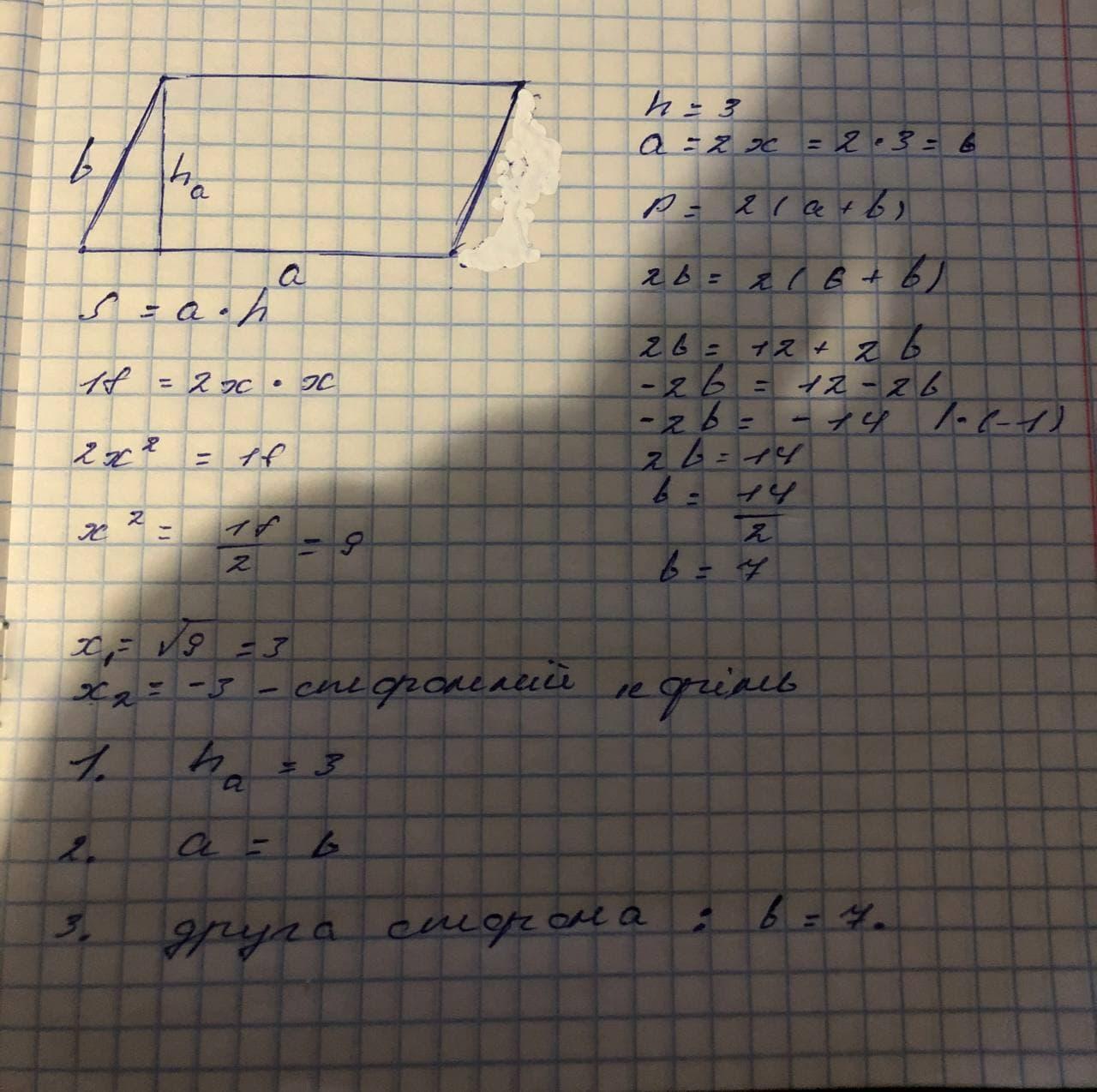 Площа паралелограма - 18см2, а його периметр - 26 см. Висота, проведена до однієї з його сторін, у 2 рази менше, ніж ця сторона. Обчисли: