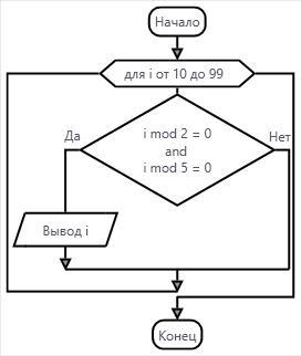 Вывести на экран те из двузначных чисел, которые одновременно делятся на 2 и на 5. Построить блок-схему
