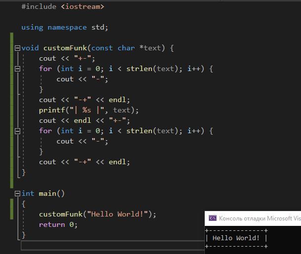 Напишите функцию, которая принимает на вход строку текста и печатает ее на экран в рамочке из символов +, - и |. Для красоты текст должен отделяться от рамки слева и справа пробелом. Например, текст Hello world должен выводиться так: