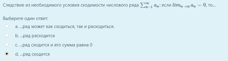 Стремление n-го члена ряда к 0 не является достаточным условием сходимости ряда: если an⇒0, то ряд может как сходиться, так и расходиться. Пример - гармонический ряд ∑1/n расходится, а ряд обратных квадратов ∑1/n² сходится.