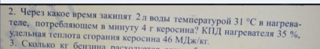 n = (Qп / Qз)*100% = ((c*m1*(t2 - t1)) / (q*t*v)) * 100% = (100%*(c*m1*(t2 - t1))) / (q*t*v) => t = (100%*(c*m1*(t2 - t1))) / (q*v*n) = (100*(4,2*10^3*2*(100 - 31))) / 46*10^6*4*10^(-3)*35 = 9 минут = 9*60 = 540 секунд