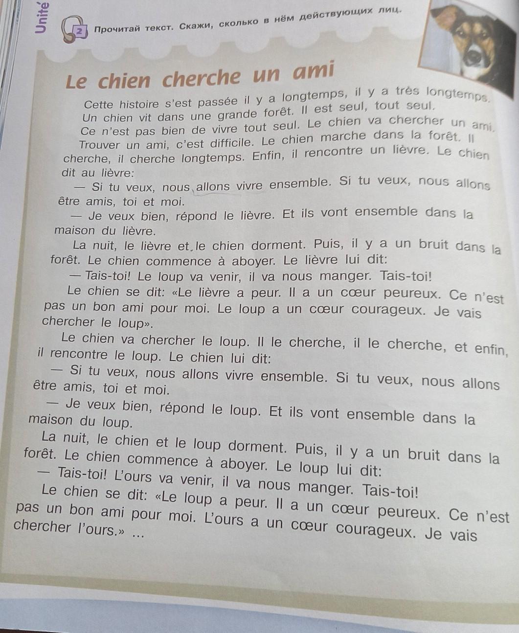 В тексте 3 действующих лиц (не считая медведя про которого просто идёт разговор): собака( chien) , кролик (lièvre) и волк (loup