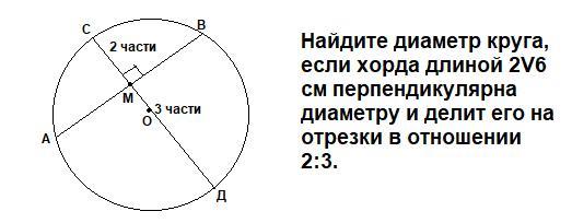 Найдите диаметр круга, если хорда длиной 2V6 см перпендикулярна диаметру и делит его на отрезки в отношении 2:3.