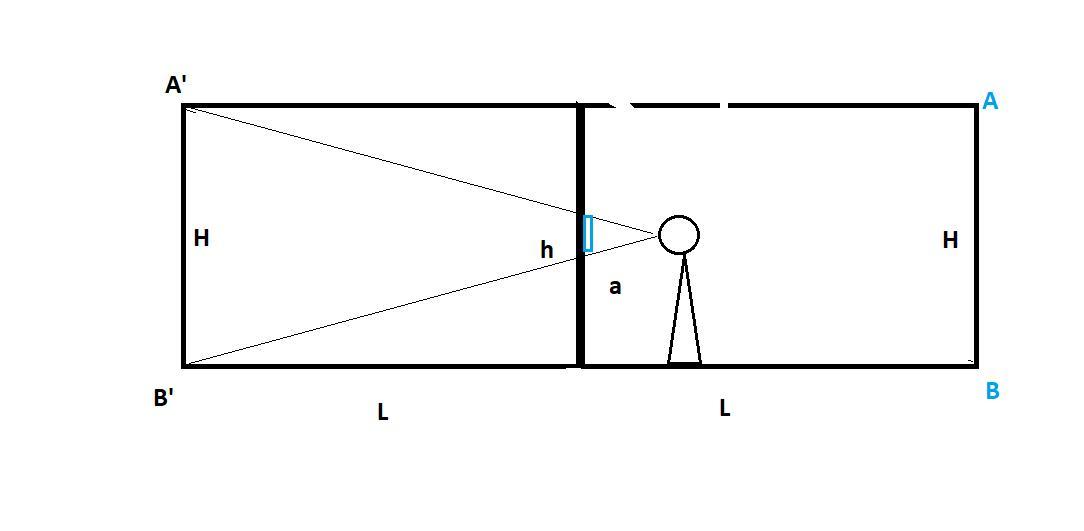 Комната имеет длину 4 м и высоту 3 м. На одной стене комнаты вертикально висит зеркало. Человек стоит на расстоянии 1 м от зеркала лицом к зеркалу. Какой должна быть минимальная высота зеркала, чтобы человек мог видеть находящуюся за его спиной стену в полную высоту (от пола до потолка)? Ответ выразите в см, округлите до целого числа.
