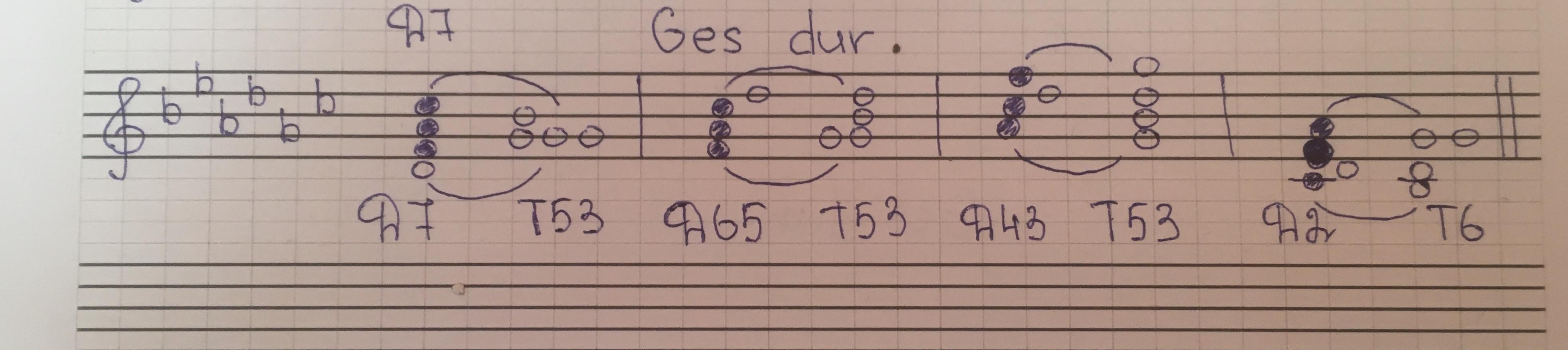Доминантовый септаккорд и его обращения в тональности Ges dur (при ключе 6 бемолей : си, ми, ля, ре, соль, до).