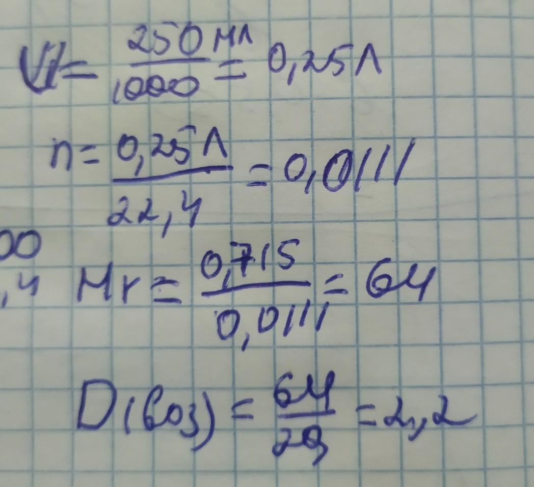 С РЕШЕНИЕМ!!! 250 мл газа при н.у имеют массу 0,715 г. Вычислите плотность этого газа по отношению к воздуху.