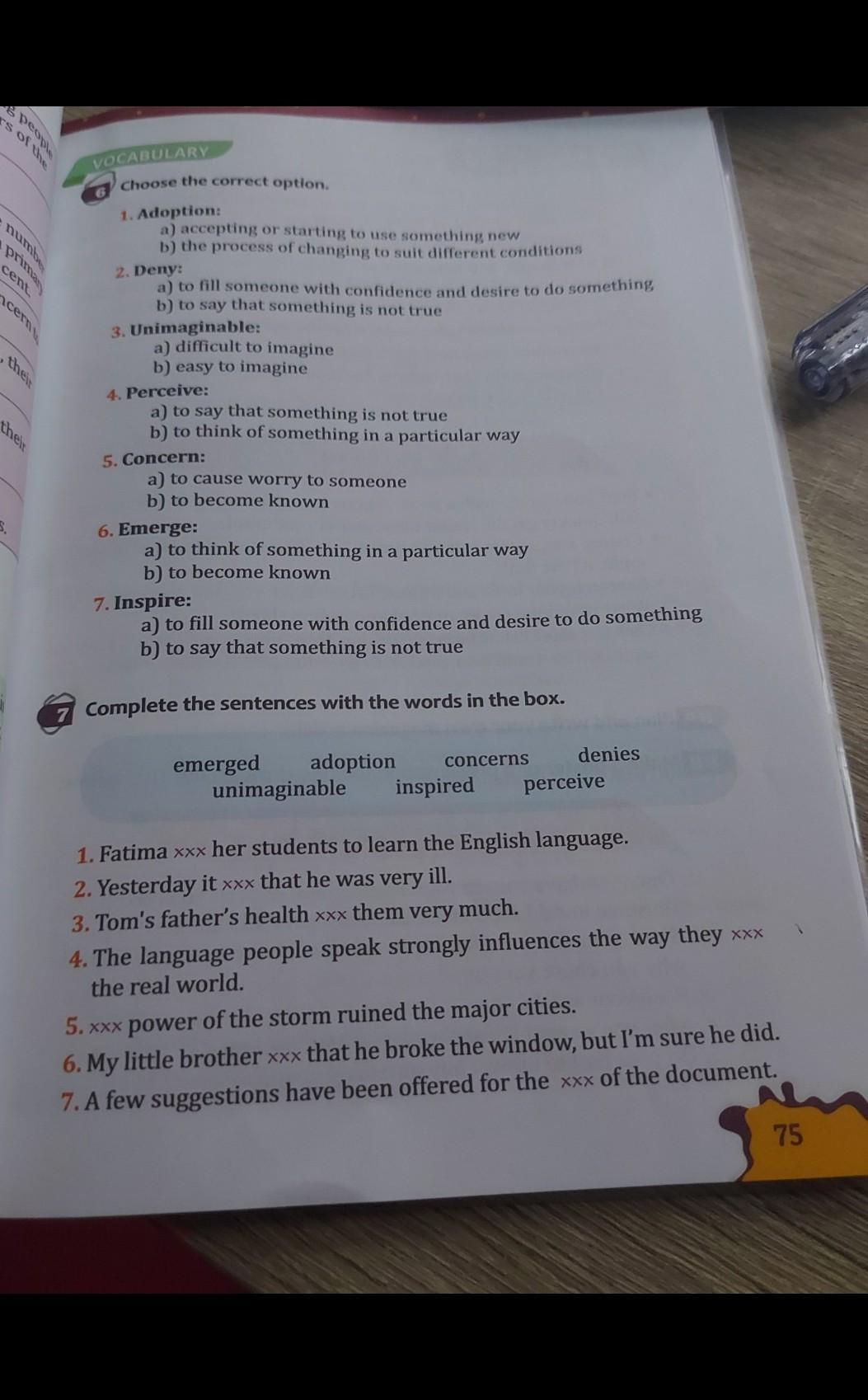 7. 1. Fatima inspired her students to learn the English language. 2. Yesterday it emergen that he was very ill. 4. The language people speak strongly influences the way they perceive the real world. 3. Tom's father's health xxx them very much. 5. unimaginable power of the storm ruined the major cities. 6. My little brother denies that he broke the window, but I'm sure he did. 7. A few suggestions have been offered for the adoption of the document.