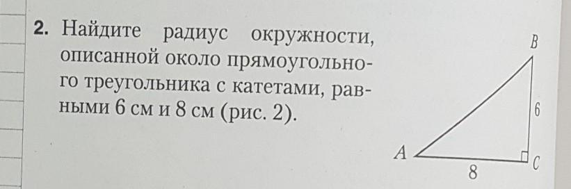 треугольник АВС, уголС=90, АС=6, ВС=8, АВ=корень(АС в квадрате+ВС в квадрате)=корень(36+64)=10, радиус описанной окружности=АС/2=10/2=5, для прямоугольного треугольника гипотенуза = диаметру описанной окружности