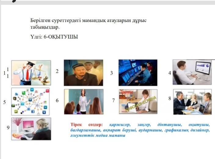 1)зангер 2)динтанушы 3)багдарламашы 4)графилалык дизайнер 5)алеуметтик медиа маманы 6)окытушы 7)каржыгер 8)аудармашы 9)акпарат беруши