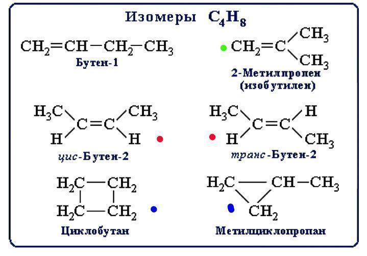 Червоний - одночасно ізомерія положення подвійного за'язку та просторова ізомерія