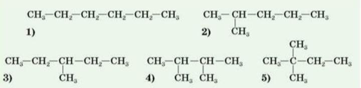 1) гексан, 2) 2-метилпентан 3) 3- метилпентан 4) 2,3- диметилбутан, 5) 2,2 - диметилбутан