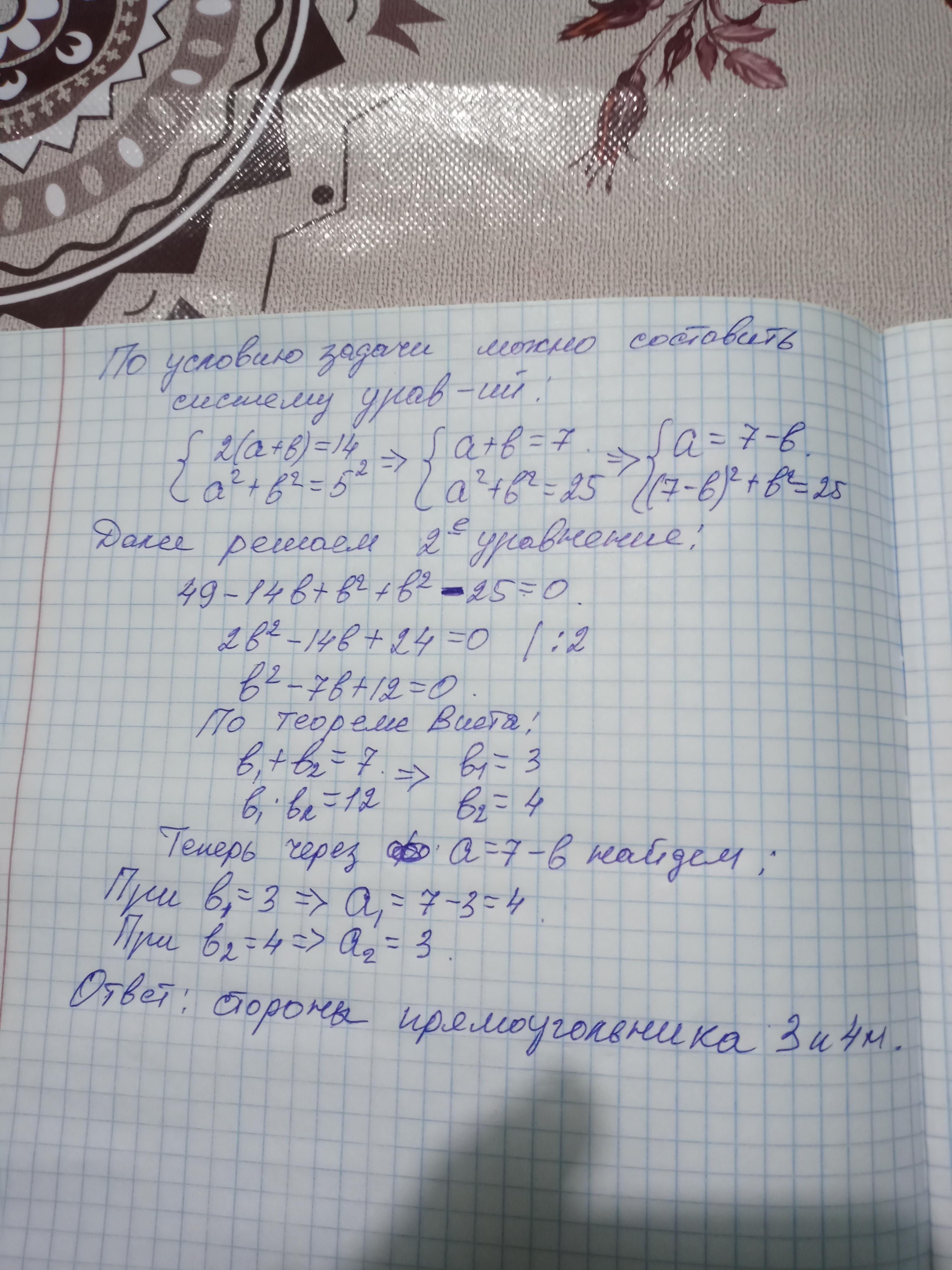 диагональ прямоугольника равна 5 м , а eго периметр равен 14 м .