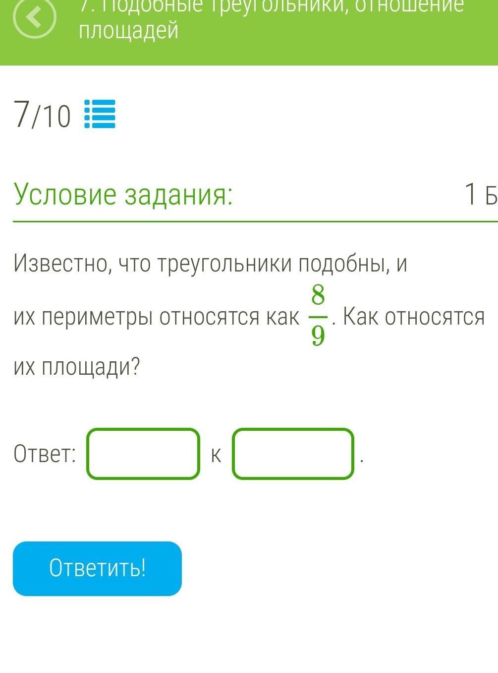Отношение площадей подобных треугольников равно квадрату коэффициента подобия, то есть в данном случае 64/81
