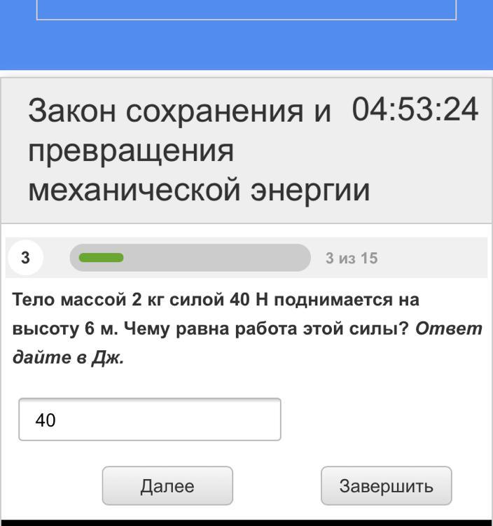 Тело массой 2 кг силой 40 Н поднимается на высоту 6м. Чему равна работа этой силы?