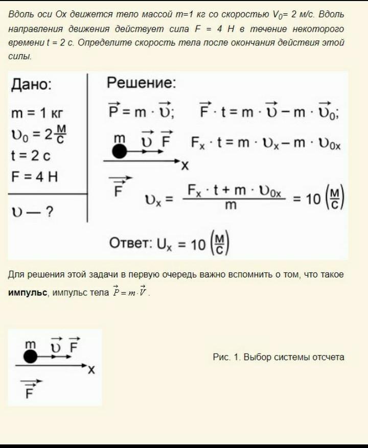 Вдоль оси Ох движется тело массой m=1 кг со скоростью V0= 2 м/с. Вдоль направления движения действует сила F = 4 Н в течение некоторого времени t = 2 с. Определите скорость тела после окончания действия этой силы.