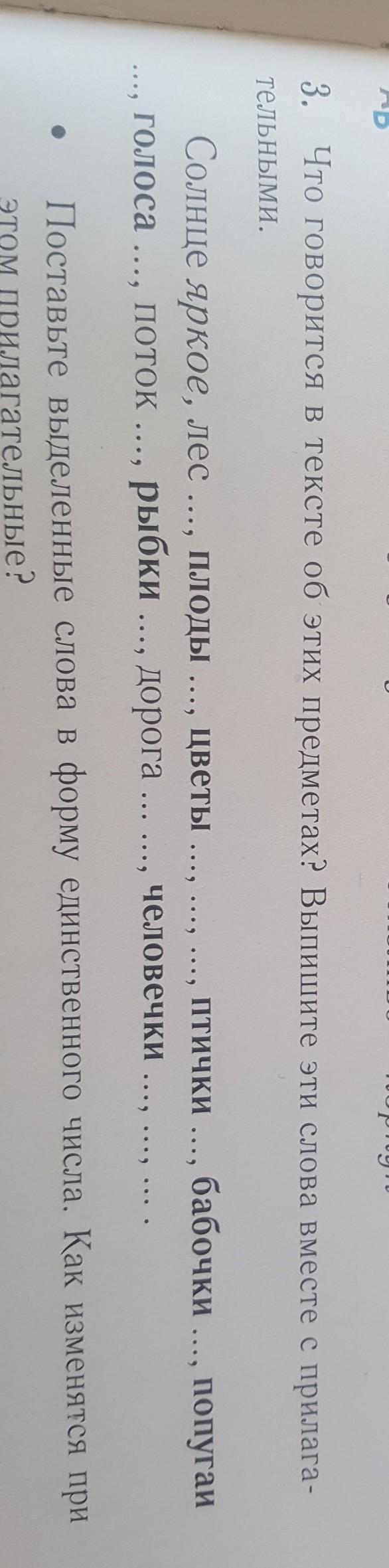 лес зелёный; плоды спелые; цветы розовые, белые, голубые; птички крошечные; бабочки разноцветные; попугаи золотисто-зелёные; голоса странные; поток прозрачный; рыбки серебристые; дорога желтая кирпичная; человечки забавные, милые, маленькие.