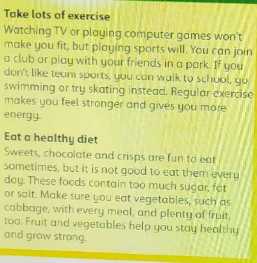 Смотреть телевизор или играть в компьютерные игры не поможет держать тебя в форме,но спортивные игры,спорт-могут.Ты можешь присоедениться к клубу или играть с твоими друзьями в парке.Если ты не любишь командный спорт,ты можешь пройтись к школе,пойти плавать или же попроьовать катание на скейте вместо всего этого.Регулярные упражнения помогут чувствовать себя сильнее и даст тебе больше енергии.