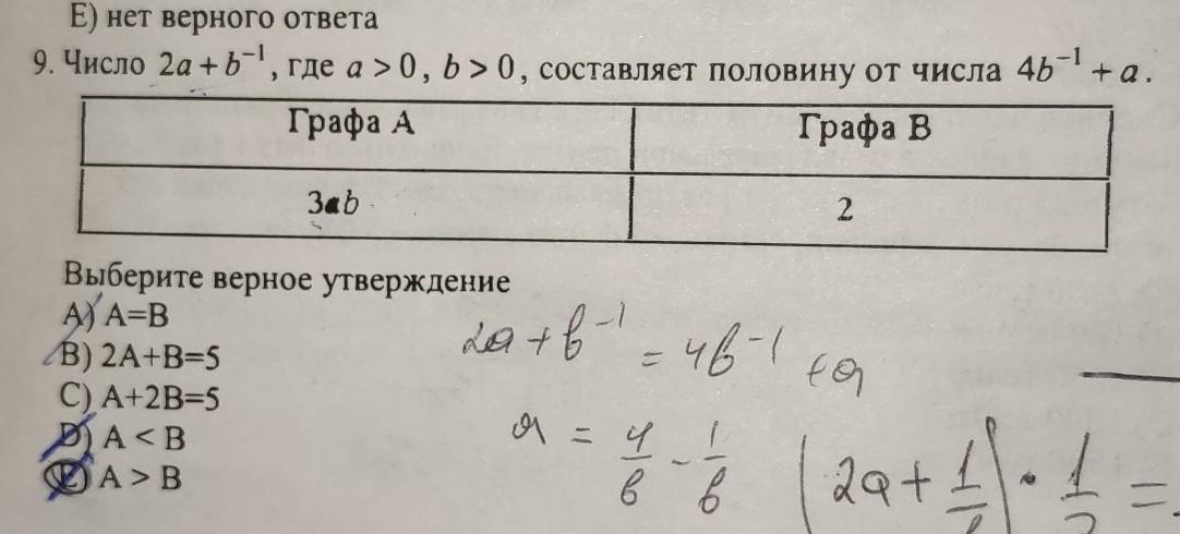 4)4ab+2=4+ab ⇒3ab=2, т.е подходит утверждение А)А=В