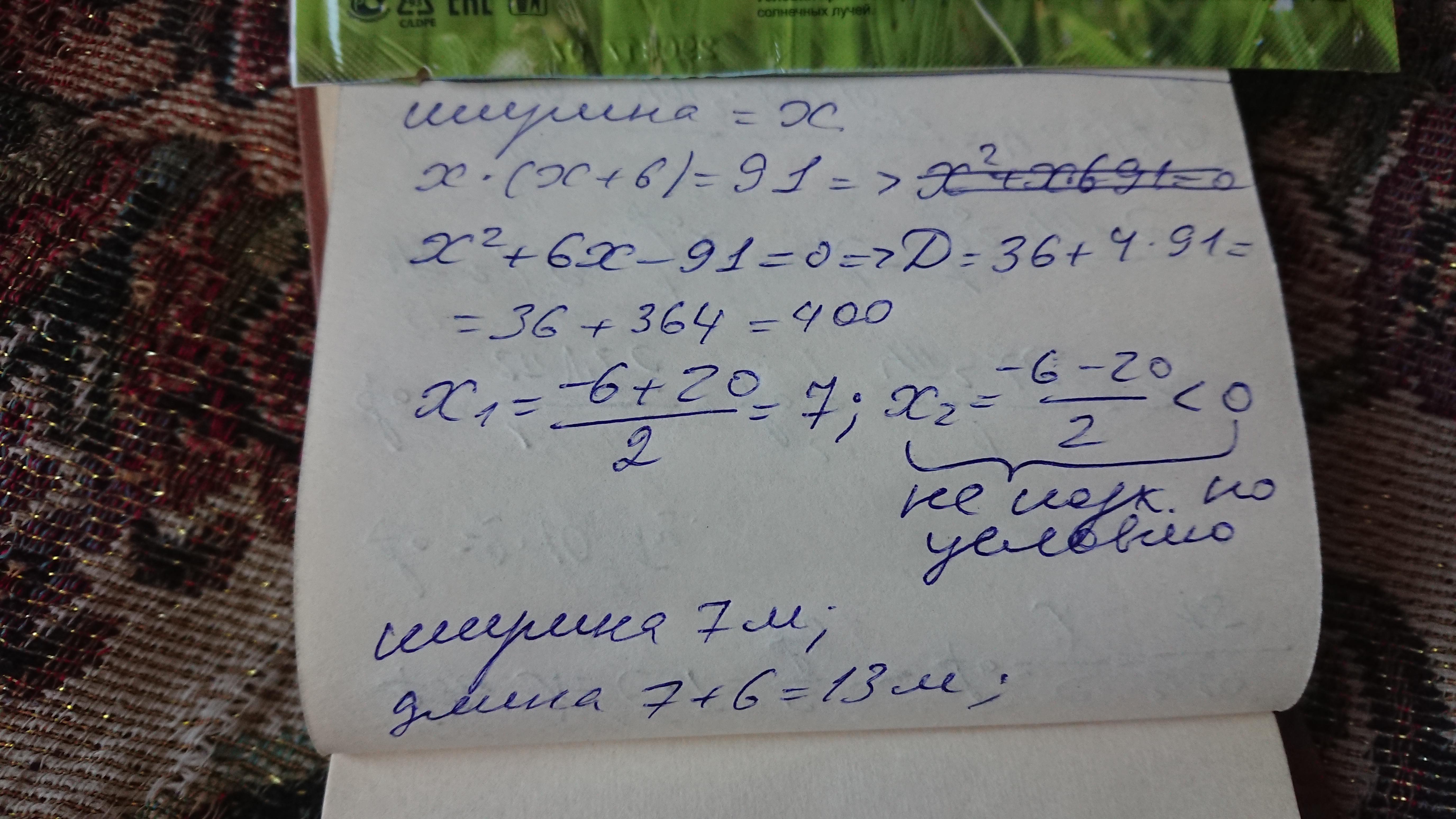 Длина прямоугольного помещения на 6 см больше ширины, площадь 91. Найдите длину и ширину комнаты
