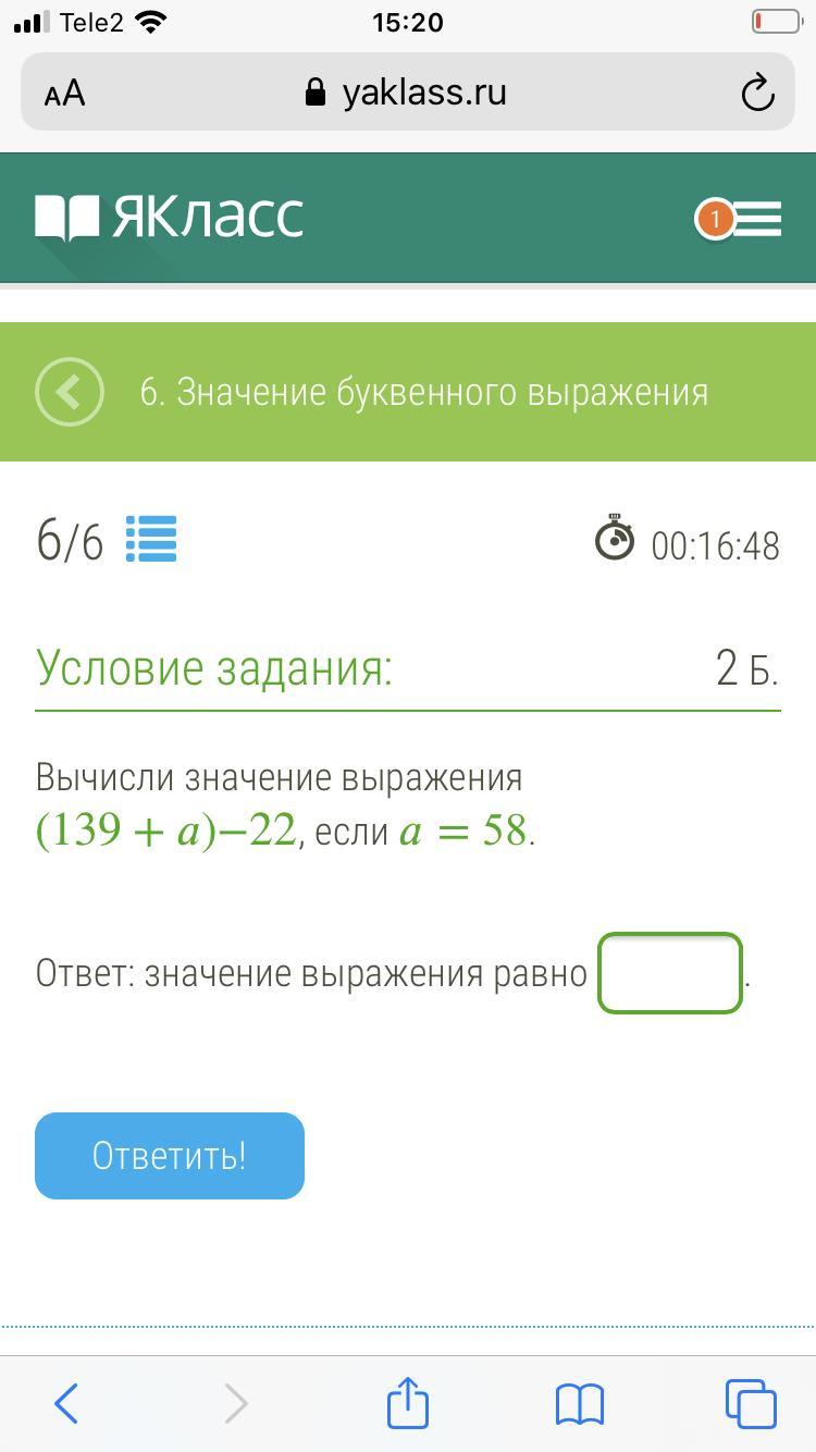 Осталось 16 мин!! Вычисли значение выражения (139+)−22, если = 58.