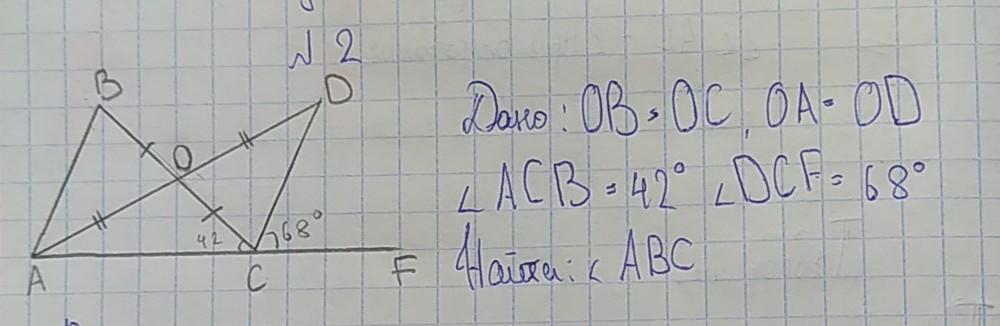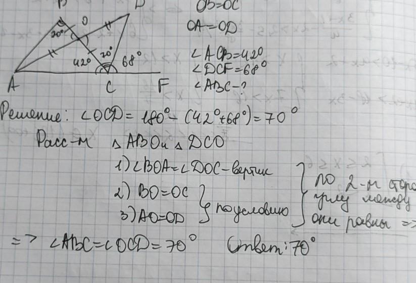 решение. АВО и DCO равны по 2м сторонам и углу между ними(две стороны по условию и углы как вертикальные) тк они равны, то угол АВС равен OCD(OCD=180°-110°=70°) и равен 70 градусам