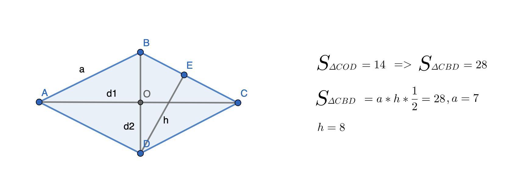 Знайдіть висоту ромба, якщо площа трикутника DOC – 14 см²
