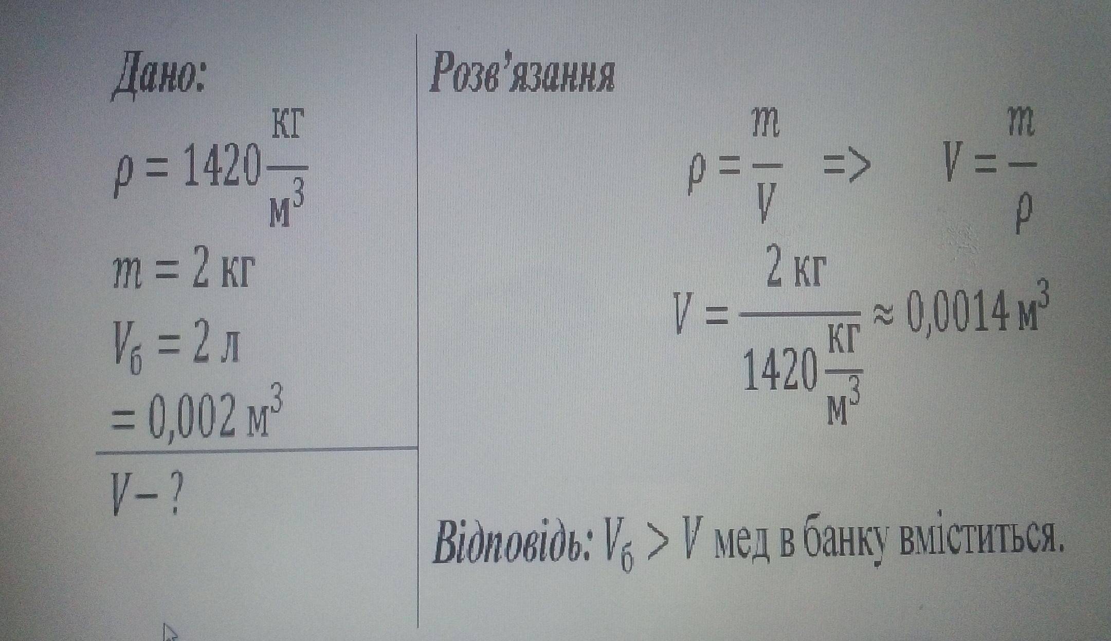 Вам потрібно купити 2 кг меду, а ви маєте скляну банку об'ємом 2 л. Чи вміститься в банку необхідна кількість меду?