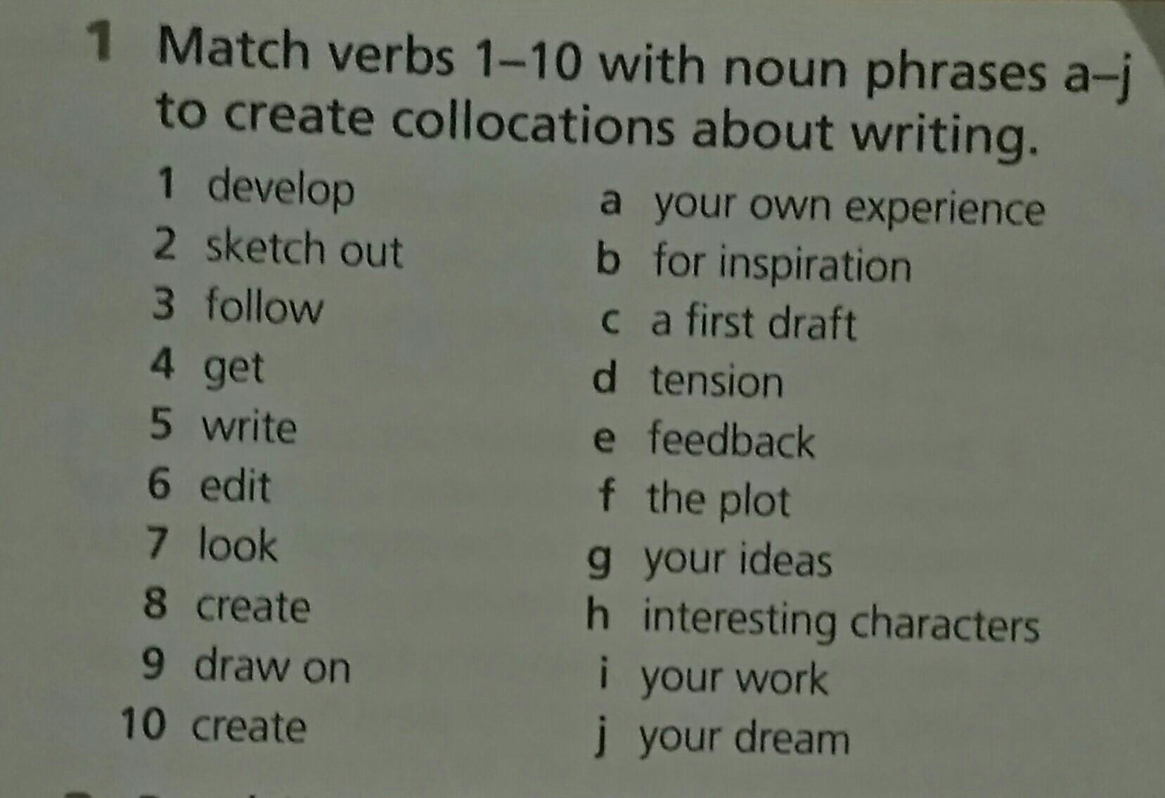 Match verbs 1-10 with noun phrases a-j to create collocations about writing