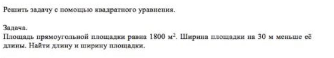 Площадь прямоугольной площадки равна 1800 м^2. Ширина площадки на 30 м меньше её длины. Найти длину и ширину площадки.