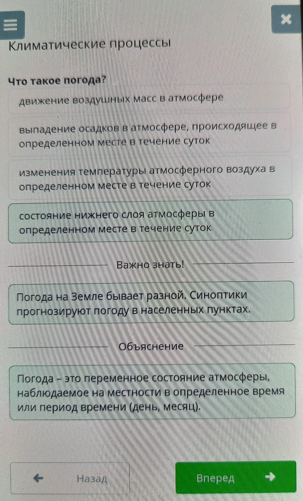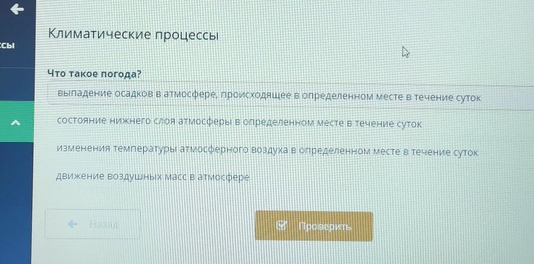 правильный ответ перемерное состояние атмосферы, наблюдаемое на месности в определенное или период времени (день, месяц)