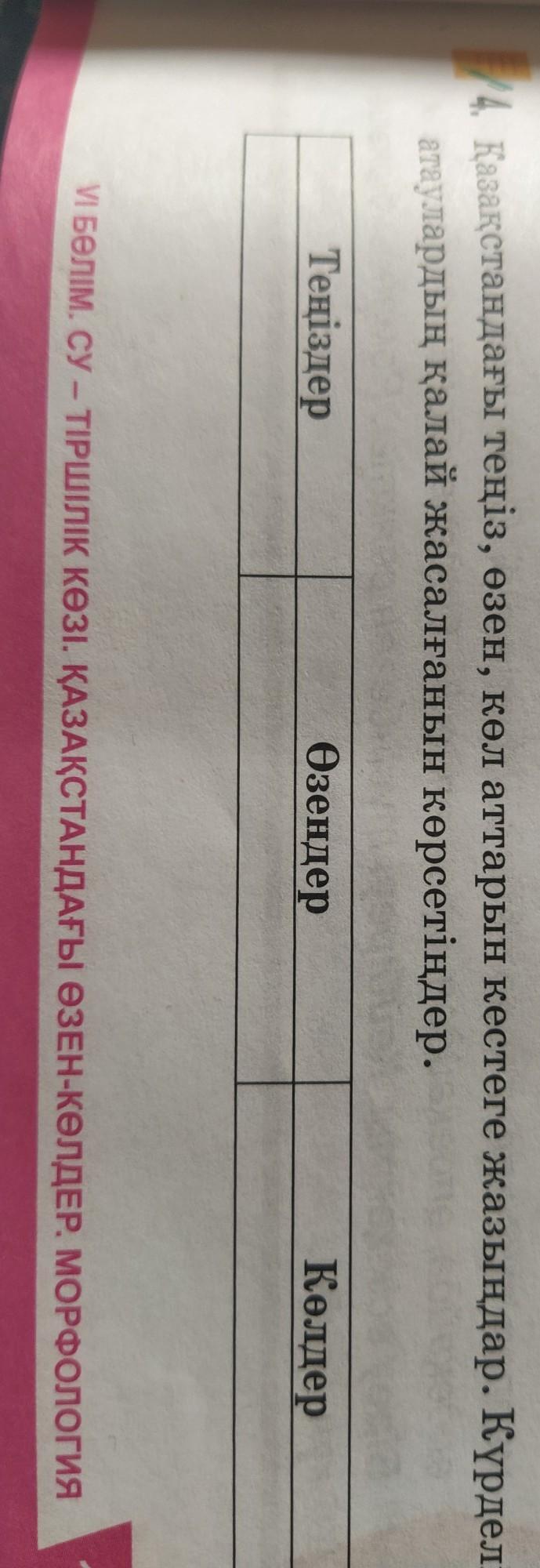 Қазақстандағы теңіз,өзен,көл, аттарын кестеге жазыңдар.Күрделі атаулардың қалай жасалғанын көрсетіңдер